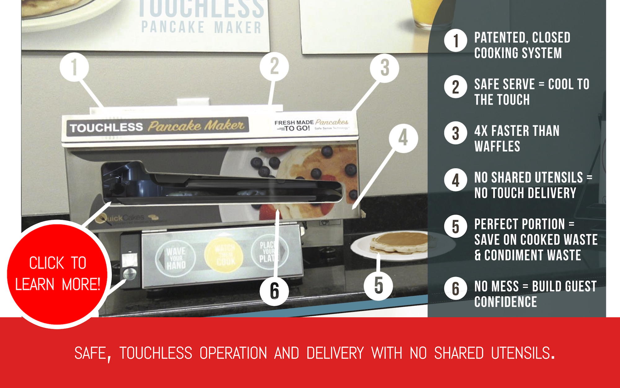 Fresh, hot pancakes on demand. Guests get made-to-order pancakes in under a minute with no griddle, no flipping, and consistent results every time.